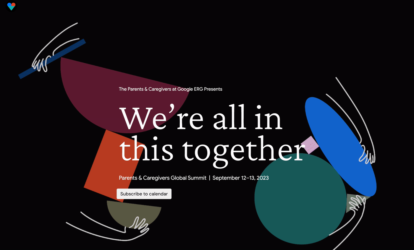The Parents & Caregivers Google Group supports Googlers in caregiving roles. As Design Lead, I created the brand system for their website, newsletters, and the first Global Summit, themed We’re All in This Together. The visual identity was inspired by helping hands and building blocks—symbols of support, care, and collective growth.